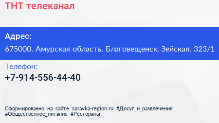 ТНТ, телеканал по адресу 675000, Амурская область, Благовещенск, Зейская, 323/1 в дальнейшем Организация, размещена в следующих категориях: