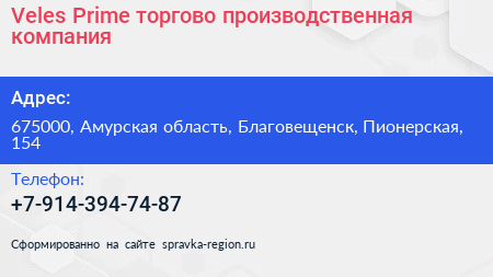 Veles Prime, торгово-производственная компания по адресу 675000, Амурская область, Благовещенск, Пионерская, 154 в дальнейшем Организация, размещена в следующих категориях:
