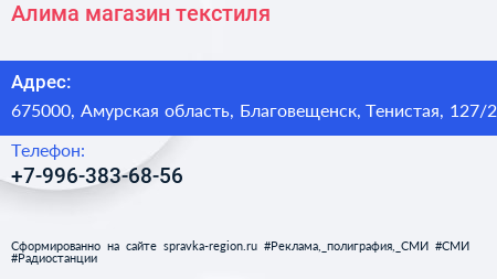 Алима, магазин текстиля по адресу 675000, Амурская область, Благовещенск, Тенистая, 127/2 в дальнейшем Организация, размещена в следующих категориях: