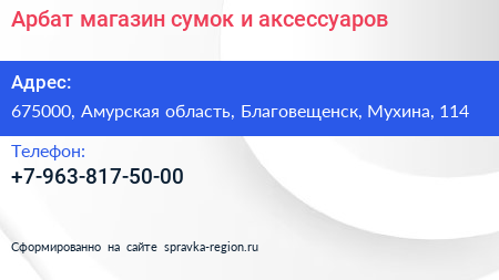 Арбат, магазин сумок и аксессуаров по адресу 675000, Амурская область, Благовещенск, Мухина, 114 в дальнейшем Организация, размещена в следующих категориях: