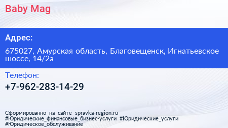 Baby Mag по адресу 675027, Амурская область, Благовещенск, Игнатьевское шоссе, 14/2а в дальнейшем Организация, размещена в следующих категориях: