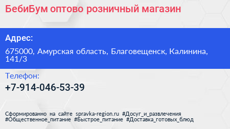 БебиБум, оптово-розничный магазин по адресу 675000, Амурская область, Благовещенск, Калинина, 141/3 в дальнейшем Организация, размещена в следующих категориях: