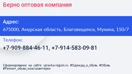 Берно, оптовая компания по адресу 675000, Амурская область, Благовещенск, Мухина, 150/7 в дальнейшем Организация, размещена в следующих категориях: