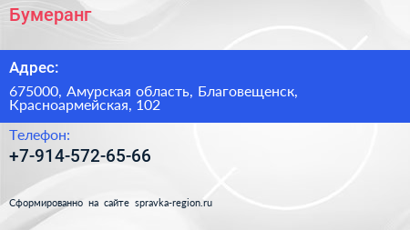 Бумеранг по адресу 675000, Амурская область, Благовещенск, Красноармейская, 102 в дальнейшем Организация, размещена в следующих категориях: