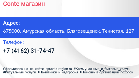 Conte, магазин по адресу 675000, Амурская область, Благовещенск, Тенистая, 127 в дальнейшем Организация, размещена в следующих категориях: