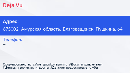 Deja Vu по адресу 675002, Амурская область, Благовещенск, Пушкина, 64 в дальнейшем Организация, размещена в следующих категориях: