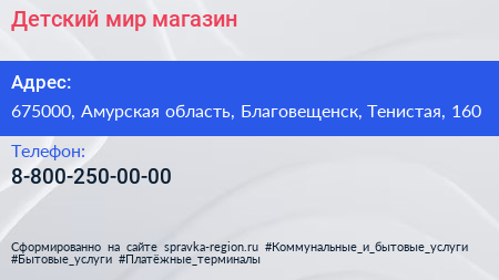 Детский мир, магазин по адресу 675000, Амурская область, Благовещенск, Тенистая, 160 в дальнейшем Организация, размещена в следующих категориях: