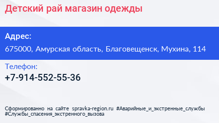 Детский рай, магазин одежды по адресу 675000, Амурская область, Благовещенск, Мухина, 114 в дальнейшем Организация, размещена в следующих категориях: