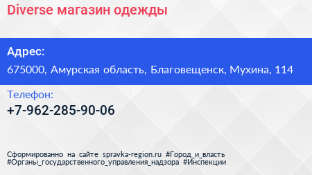 Diverse, магазин одежды по адресу 675000, Амурская область, Благовещенск, Мухина, 114 в дальнейшем Организация, размещена в следующих категориях: