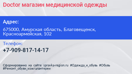 Doctor, магазин медицинской одежды по адресу 675000, Амурская область, Благовещенск, Красноармейская, 102 в дальнейшем Организация, размещена в следующих категориях: