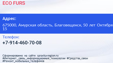 ECO FURS по адресу 675000, Амурская область, Благовещенск, 50 лет Октября, 15 в дальнейшем Организация, размещена в следующих категориях: