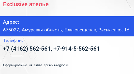 Exclusive, ателье по адресу 675027, Амурская область, Благовещенск, Василенко, 16 в дальнейшем Организация, размещена в следующих категориях: