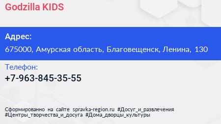 Godzilla KIDS по адресу 675000, Амурская область, Благовещенск, Ленина, 130 в дальнейшем Организация, размещена в следующих категориях: