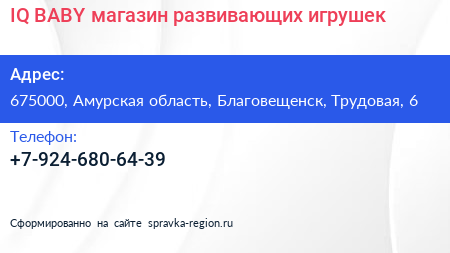 IQ BABY, магазин развивающих игрушек по адресу 675000, Амурская область, Благовещенск, Трудовая, 6 в дальнейшем Организация, размещена в следующих категориях: