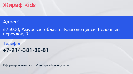 Жираф Kids по адресу 675000, Амурская область, Благовещенск, Рёлочный переулок, 3 в дальнейшем Организация, размещена в следующих категориях:
