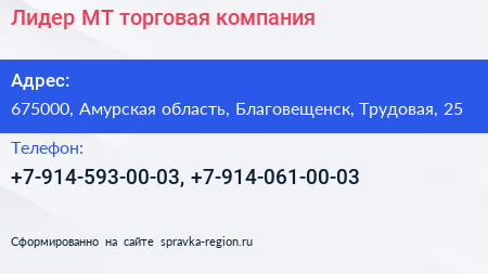 Лидер МТ, торговая компания по адресу 675000, Амурская область, Благовещенск, Трудовая, 25 в дальнейшем Организация, размещена в следующих категориях: