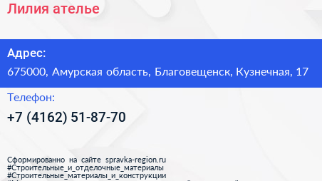Лилия, ателье по адресу 675000, Амурская область, Благовещенск, Кузнечная, 17 в дальнейшем Организация, размещена в следующих категориях: