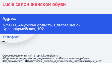 Lucia, салон женской обуви по адресу 675000, Амурская область, Благовещенск, Красноармейская, 102 в дальнейшем Организация, размещена в следующих категориях: