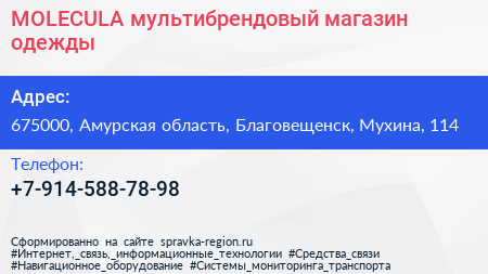 MOLECULA, мультибрендовый магазин одежды по адресу 675000, Амурская область, Благовещенск, Мухина, 114 в дальнейшем Организация, размещена в следующих категориях: