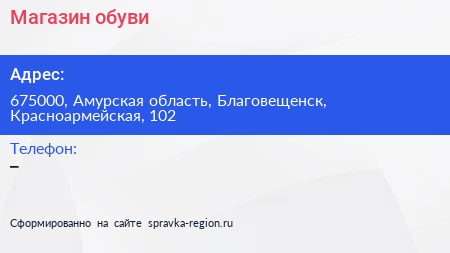 Магазин обуви по адресу 675000, Амурская область, Благовещенск, Красноармейская, 102 в дальнейшем Организация, размещена в следующих категориях: