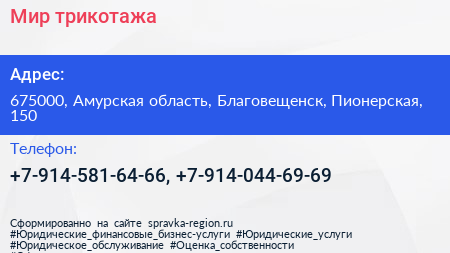 Мир трикотажа по адресу 675000, Амурская область, Благовещенск, Пионерская, 150 в дальнейшем Организация, размещена в следующих категориях: