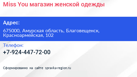 Miss You, магазин женской одежды по адресу 675000, Амурская область, Благовещенск, Красноармейская, 102 в дальнейшем Организация, размещена в следующих категориях:
