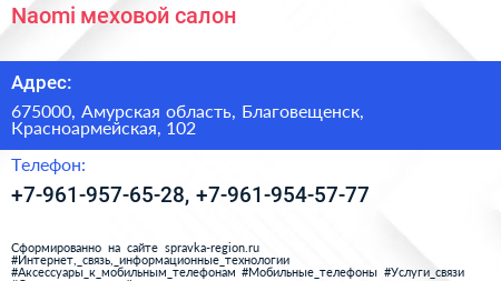 Naomi, меховой салон по адресу 675000, Амурская область, Благовещенск, Красноармейская, 102 в дальнейшем Организация, размещена в следующих категориях: