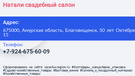 Натали, свадебный салон по адресу 675000, Амурская область, Благовещенск, 50 лет Октября, 15 в дальнейшем Организация, размещена в следующих категориях: