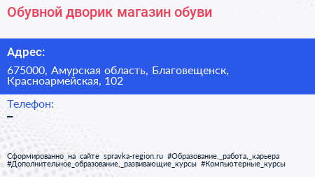 Обувной дворик, магазин обуви по адресу 675000, Амурская область, Благовещенск, Красноармейская, 102 в дальнейшем Организация, размещена в следующих категориях:
