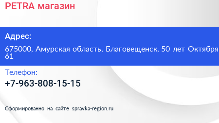 PETRA, магазин по адресу 675000, Амурская область, Благовещенск, 50 лет Октября, 61 в дальнейшем Организация, размещена в следующих категориях: