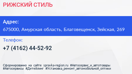 РИЖСКИЙ СТИЛЬ по адресу 675000, Амурская область, Благовещенск, Зейская, 269 в дальнейшем Организация, размещена в следующих категориях: