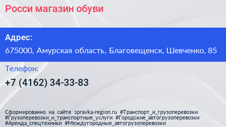Росси, магазин обуви по адресу 675000, Амурская область, Благовещенск, Шевченко, 85 в дальнейшем Организация, размещена в следующих категориях: