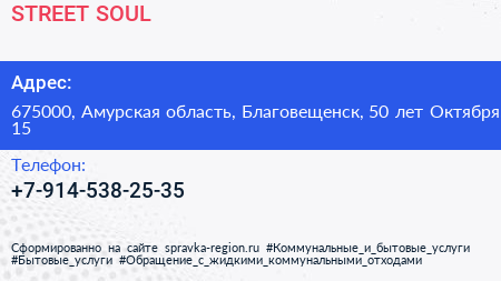 STREET SOUL по адресу 675000, Амурская область, Благовещенск, 50 лет Октября, 15 в дальнейшем Организация, размещена в следующих категориях: