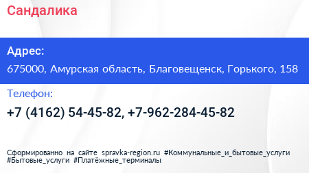Сандалика по адресу 675000, Амурская область, Благовещенск, Горького, 158 в дальнейшем Организация, размещена в следующих категориях: