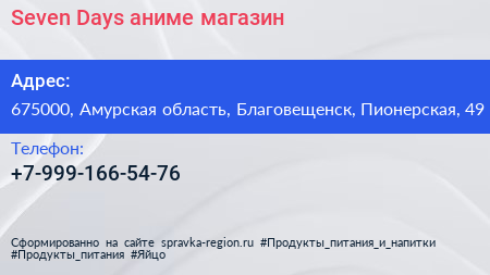Seven Days, аниме-магазин по адресу 675000, Амурская область, Благовещенск, Пионерская, 49 в дальнейшем Организация, размещена в следующих категориях:
