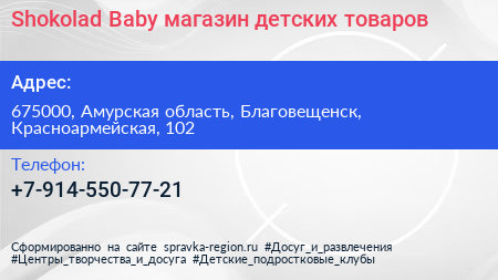 Shokolad Baby, магазин детских товаров по адресу 675000, Амурская область, Благовещенск, Красноармейская, 102 в дальнейшем Организация, размещена в следующих категориях:
