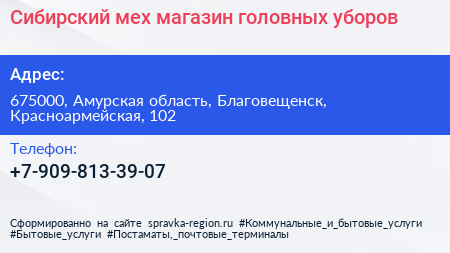 Сибирский мех, магазин головных уборов по адресу 675000, Амурская область, Благовещенск, Красноармейская, 102 в дальнейшем Организация, размещена в следующих категориях:
