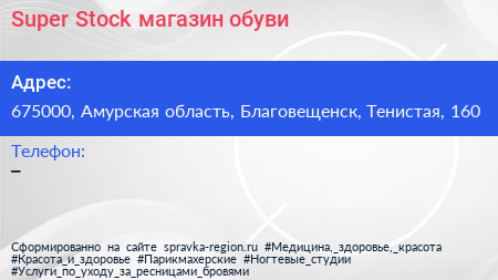 Super Stock, магазин обуви по адресу 675000, Амурская область, Благовещенск, Тенистая, 160 в дальнейшем Организация, размещена в следующих категориях: