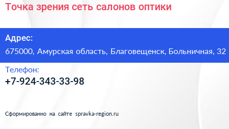 Точка зрения, сеть салонов оптики по адресу 675000, Амурская область, Благовещенск, Больничная, 32 в дальнейшем Организация, размещена в следующих категориях:
