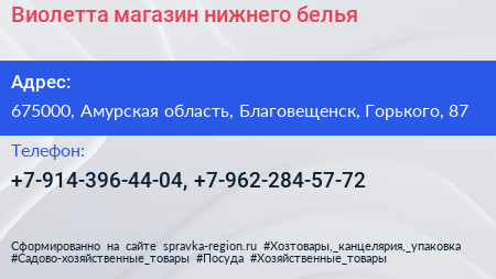Виолетта, магазин нижнего белья по адресу 675000, Амурская область, Благовещенск, Горького, 87 в дальнейшем Организация, размещена в следующих категориях: