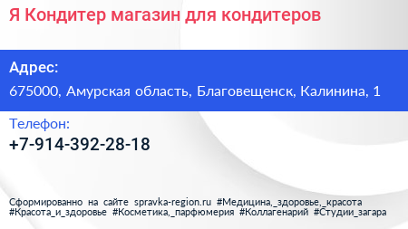 Я Кондитер, магазин для кондитеров по адресу 675000, Амурская область, Благовещенск, Калинина, 1 в дальнейшем Организация, размещена в следующих категориях: