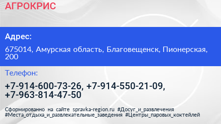 АГРОКРИС по адресу 675014, Амурская область, Благовещенск, Пионерская, 200 в дальнейшем Организация, размещена в следующих категориях: