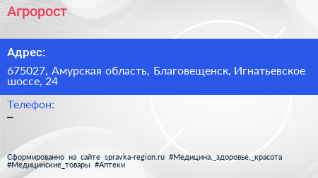 Агророст по адресу 675027, Амурская область, Благовещенск, Игнатьевское шоссе, 24 в дальнейшем Организация, размещена в следующих категориях: