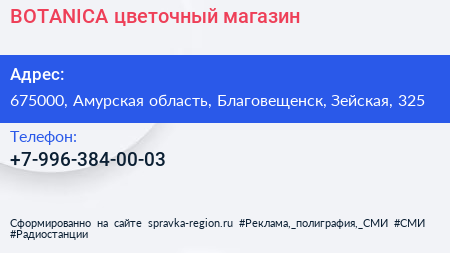 BOTANICA, цветочный магазин по адресу 675000, Амурская область, Благовещенск, Зейская, 325 в дальнейшем Организация, размещена в следующих категориях: