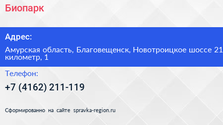 Биопарк по адресу Амурская область, Благовещенск, Новотроицкое шоссе 21 километр, 1 в дальнейшем Организация, размещена в следующих категориях:
