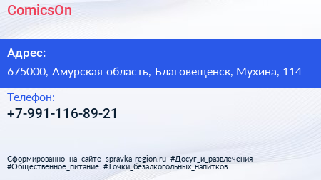 ComicsOn по адресу 675000, Амурская область, Благовещенск, Мухина, 114 в дальнейшем Организация, размещена в следующих категориях: