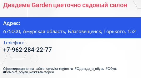 Диадема.Garden, цветочно-садовый салон по адресу 675000, Амурская область, Благовещенск, Горького, 152 в дальнейшем Организация, размещена в следующих категориях: