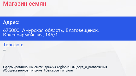 Магазин семян по адресу 675000, Амурская область, Благовещенск, Красноармейская, 145/1 в дальнейшем Организация, размещена в следующих категориях: