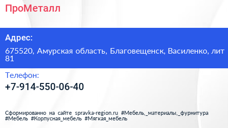 ПроМеталл по адресу 675520, Амурская область, Благовещенск, Василенко, лит 81 в дальнейшем Организация, размещена в следующих категориях: