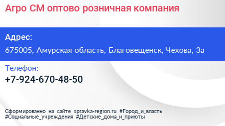 Агро СМ, оптово-розничная компания по адресу 675005, Амурская область, Благовещенск, Чехова, 3а в дальнейшем Организация, размещена в следующих категориях: